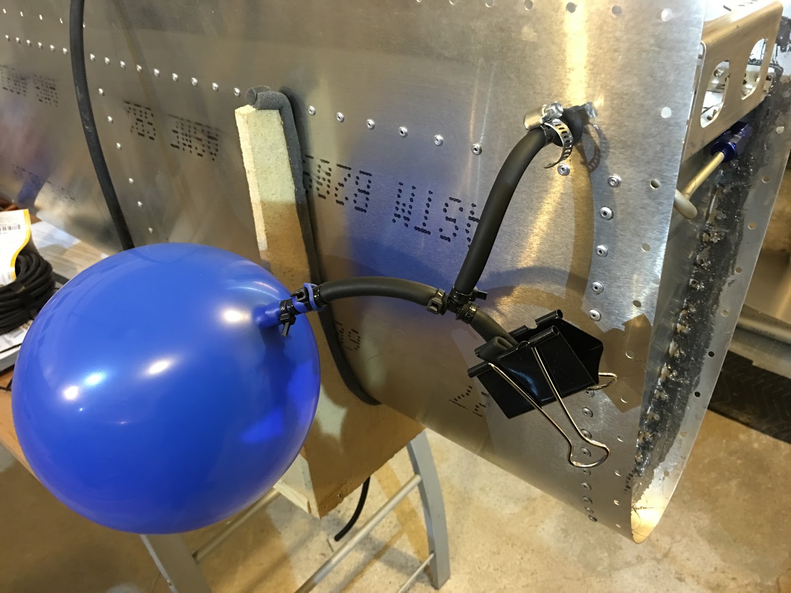 Blew it up with the right end, which pressurizes the tank and then blows up the balloon... The clip on the right seems leaky so I'm guessing it will not hold the air overnight. What I don't want to do is debug leaks of my contraption, when the goal is to test the tank. If I can't quickly resolve the contraption air loss issue I will just pressurize the tank and do the soapy water test on all the rivets and fixtures (which I'll do in any case).